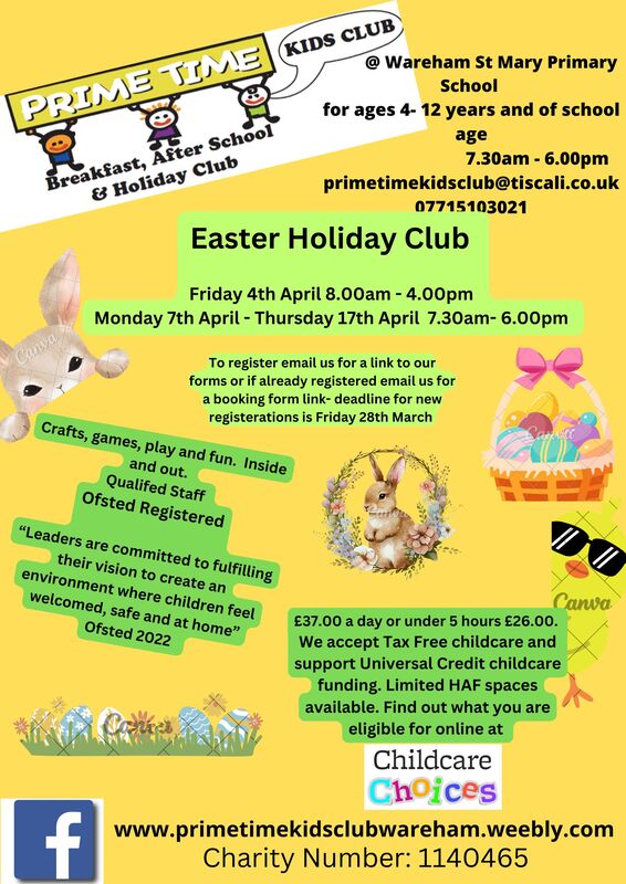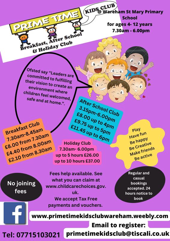 Prime Time is run by qualified, experienced and friendly staff who welcome children from Wareham St Mary’s Primary School. We welcome all children in school holidays. Please note upon registration we ask you to complete registration forms, where you must provide all information asked for. Please see Registration Forms section for more information.